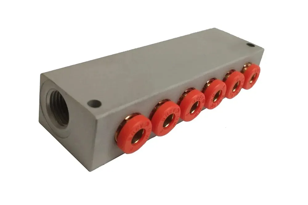 Розподільна планка з приєднаннями Ø 4-6-8 мм для використання в пневматичних системах, що дозволяє розподілити стиснене повітря під тиском на кілька інших гілок. Має додаткові отвори, що дозволяють закріпити її в потрібному місці установки. Робочий тиск: 12 бар. Робоча температура: від -10°C до +80°C. Матеріал: анодований алюміній.