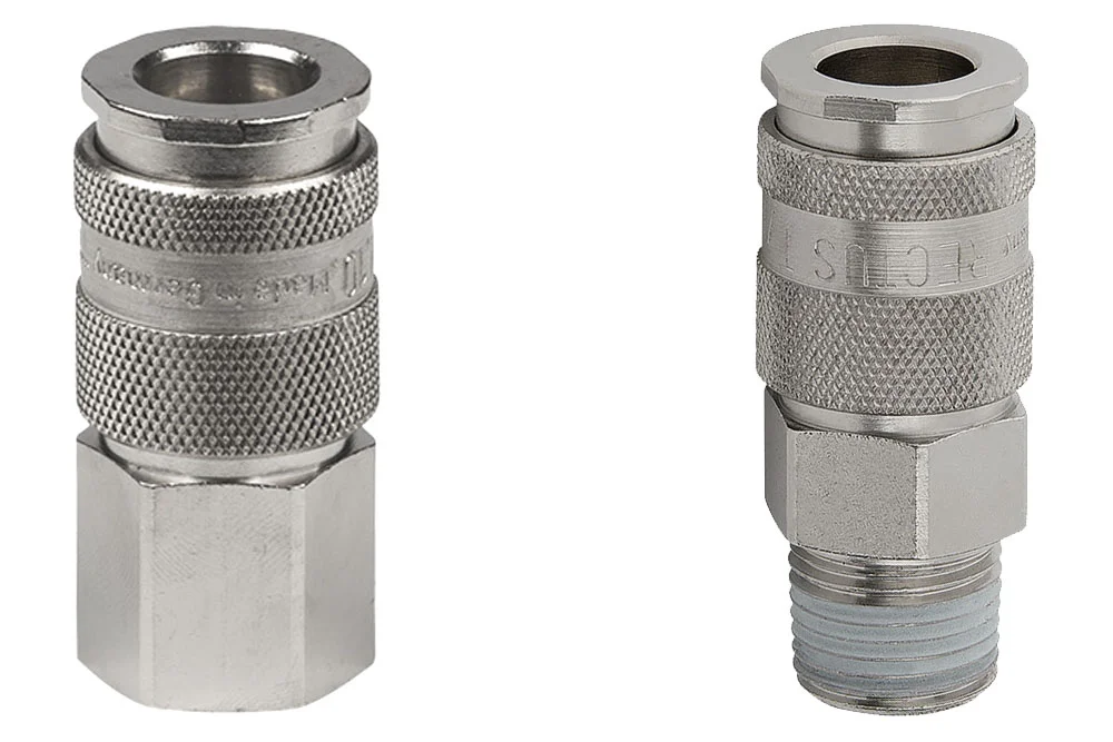 Гніздо швидкороз’ємного з’єднання з клапаном, стандартного профілю EURO DN10, з зовнішньою різьбою BSPT або з внутрішньою різьбою BSP, серія 27KA. У гнізді використано клапан ULTRA-FLO, з дуже високим коефіцієнтом потоку. Робочий тиск: 35 бар. Продуктивність: 2400 л/хв, Pe=6 бар, Δp=0,5 бар – повітря, 37,5 л/хв, Δp=1 бар, Kv=2,25 – вода. Матеріал: нікельована латунь (корпус гнізда), загартована, нікельована сталь (гільза), латунь (клапан), нержавіюча сталь (пружини, кульки та кільце). Ущільнення: NBR. Робоча температура: від -20°C до +100°C.
