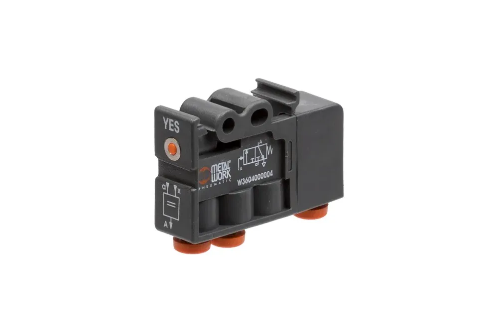 Логічний елемент YES-підтвердження. Керування за допомогою стисненого повітря, скидання за допомогою механічної пружини. Монтаж у будь-якому положенні. Матеріал: корпус – пластик, шток – алюміній, ущільнення – NBR. Номінальний потік: 100 Нл/хв для 6 бар при падінні тиску 1 бар. Вбудовані штекерні з’єднання для шланга 4 мм. Робоча температура: від -10°C до +60°C. Робочий тиск: від 0 до 8 бар. Керуючий тиск: від 1,5 до 8 бар.