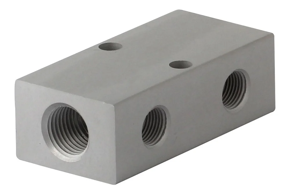 Розподільна планка з двома протилежними виходами для використання в пневматичних системах, що дозволяє розподілити стиснене повітря під тиском на кілька інших гілок. Має додаткові отвори, що дозволяють закріпити її в потрібному місці установки. Робочий тиск: 12 бар. Робоча температура: від -10°C до +80°C. Матеріал: анодований алюміній.