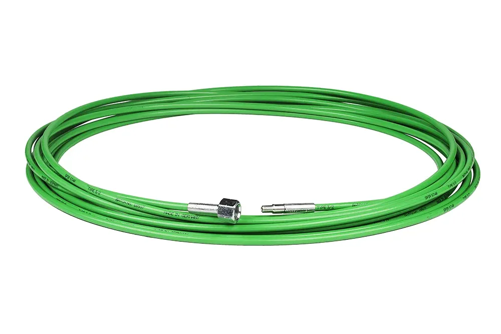 Готовий, легкий та гнучкий, двошаровий шланг, що використовується в обладнанні для різання та очищення водою. Застосування шлангів охоплює очищення хімічних та енергетичних установок, теплообмінників, очищення та різання бетонних конструкцій, дорожніх покриттів, очищення сталевих поверхонь. Шланг проходить випробування на тиск і постачається з відповідним сертифікатом. Внутрішній шар: поліоксиметилен. Зовнішній шар: поліамід. Матеріал фітингів та втулок: вуглецева сталь, оцинкована. Робочий тиск: до 1000 бар. Робоча температура: від -30°C до +70°C.